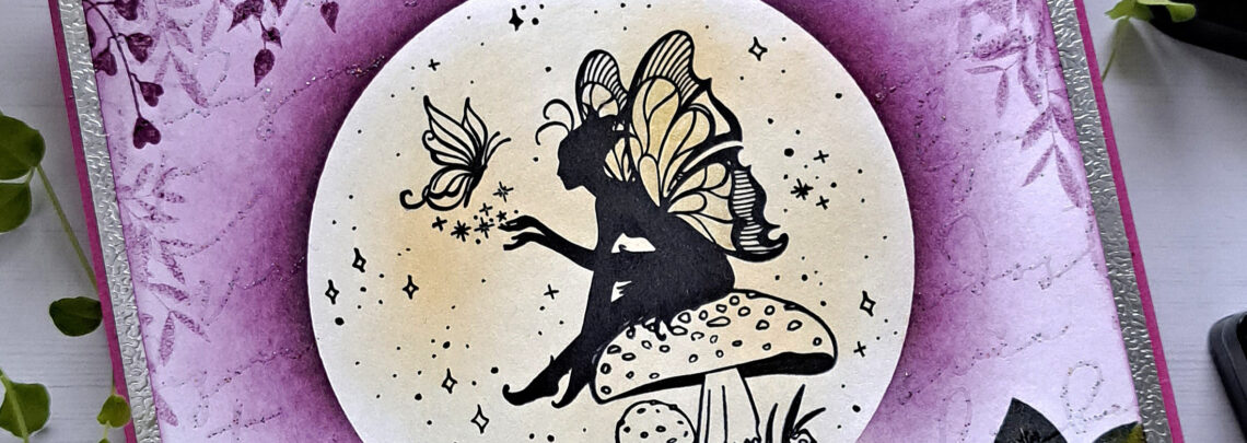 Na voščilnici sem se poigrala z naslednjim ustvarjalnim materialom: – štampiljka vile, gobe ter polžka – Tedi – štampiljke zelenja ter napisi v ozadju – Mavelu – Distress ink blazinice – prozoren embossing prah z bleščicami – srebrn karton s teksturo ter vijoličen fotokarton